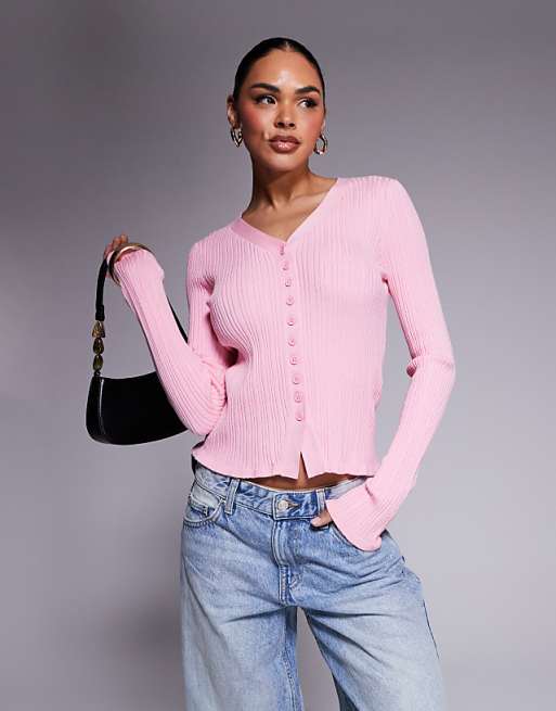 ASOS DESIGN – Gerippte Strickjacke in Rosa mit Knopfleiste, Rüschen und V Ausschnitt, Kombiteil | ASOS